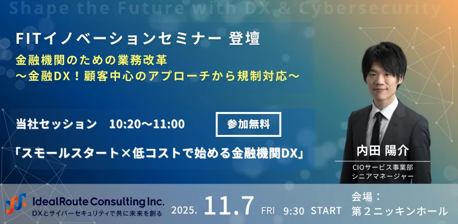 アイディルートコンサルティング株式会社が、金融機関向けのセミナー「金融機関のための業務改革 ~金融DX!顧客中心のアプローチから規制対応~」に参加します。このセミナーは、2025年11月7日(金)に東京都千代田区にて開催され、金融業界のデジタルトランスフォーメーション(DX)をテーマに専門家たちが議論を交わします。