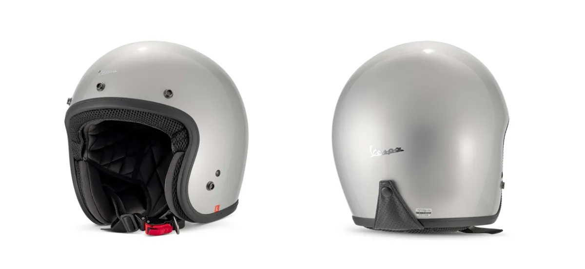 また、ヘルメットにはクロームに輝くVespaロゴが小サイズで配置されており、全体のコーディネートをさらに引き立てています。このデザインは、シンプルでありながらも大胆さを感じさせ、オシャレ感を演出してくれます。
