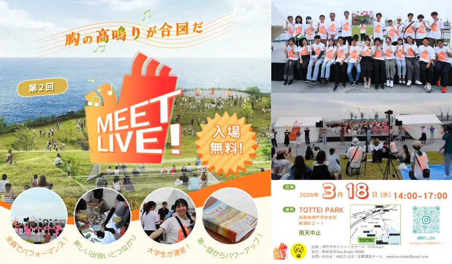 3月18日(水)、神戸市のTOTTEI PARKにて第2回「MEET LIVE!」が開催されます。このイベントは、神戸大学バリュースクール(V.School)が中心となり、学生たちが自ら企画・運営するダンスと音楽のパフォーマンスイベントです。「神戸のウォーターフロントにZ世代のコミュニティを創発する」ことを目指した取り組みの一環として、大学生たちが地域活性化に貢献します。