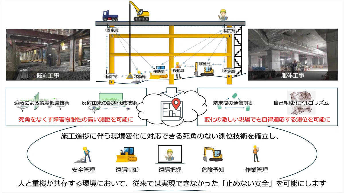 このプロジェクトでは、920MHz帯の無線通信を活用した可動型アンテナを使用して、障害物に耐性のある測距アルゴリズムを採用します。測位技術は環境変化に自動で適応し、施工進捗を管理する部分でも活用されるでしょう。多数の現場での実証実験を経て、実用化を目指しています。これは、動的な環境下で安全を確保する技術「止めない安全」を実現するものです。