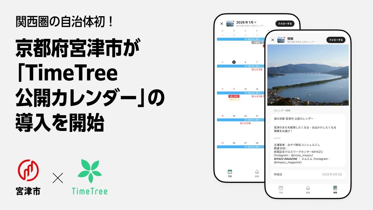 京都府宮津市が、地域の魅力をより多くの人に伝えるために、株式会社TimeTreeが提供する「TimeTree 公開カレンダー」を導入したことをご紹介します。このプロジェクトは、関西圏の自治体において初めての試みとなります。
