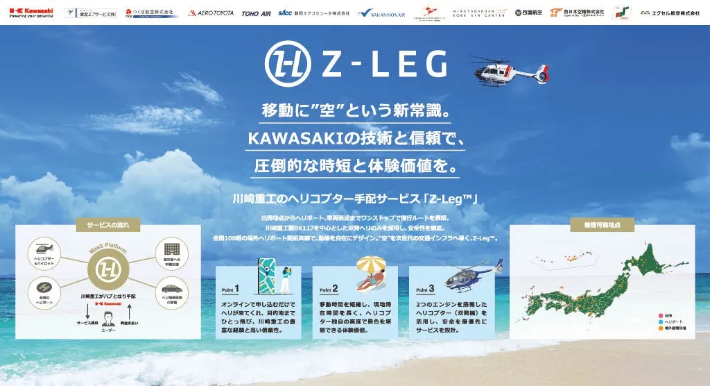 Z-Leg™は、川崎重工の社内公募制度「ビジネスアイデアチャレンジ」から生まれた新しいビジネスで、移動をより効率化し快適性を追求したヘリコプター手配サービスだ。特に、安全性には万全を期しており、双発ヘリコプターの利用がその理由の一つ。2基のエンジンを搭載したBK117などを使用し、もしもの時にも安全な飛行が保たれるようデザインされている。