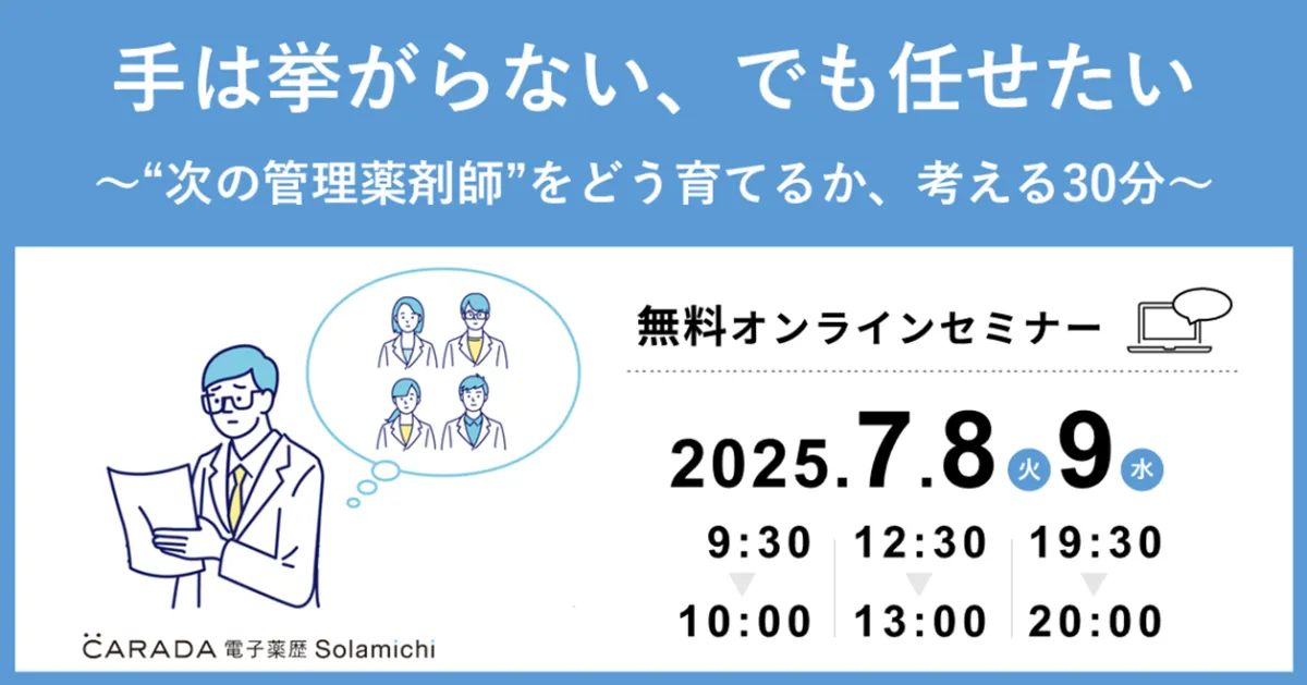 クラウド電子薬歴システムを展開する株式会社ソラミチシステムが主催するオンラインセミナー「手は挙がらない、でも任せたい。〜“次の管理薬剤師”をどう育てるか、考える30分〜」が、2023年7月8日と9日に開催されます。この無料セミナーは、今後の薬局運営や管理薬剤師の育成に関心を持つすべての薬剤師や薬局関係者を対象としています。