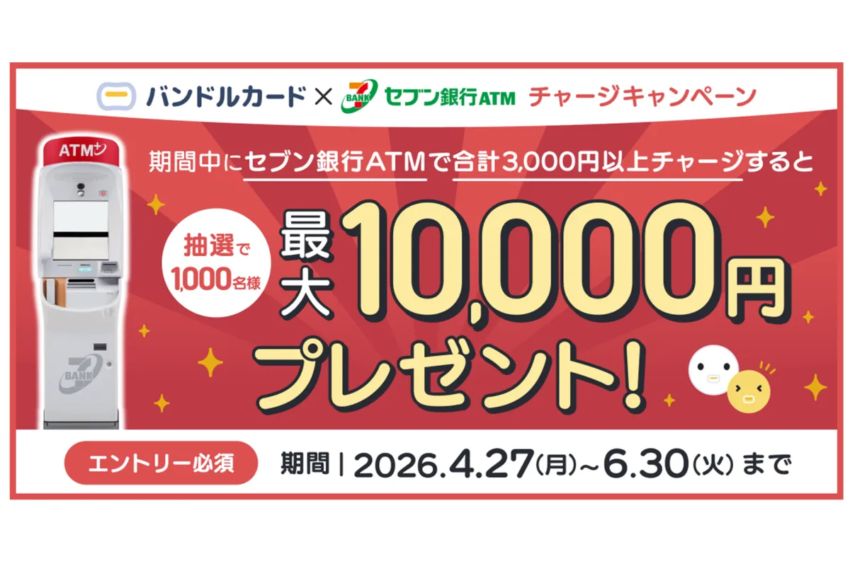 Visaプリペイドカード「バンドルカード」を提供する株式会社カンムが、2026年4月27日から「セブン銀行ATMチャージ抽選キャンペーン」を実施します。このキャンペーンでは、セブン銀行ATMからのチャージによって最大10,000円が当たるチャンスがあります。今回はその詳細についてご紹介します。