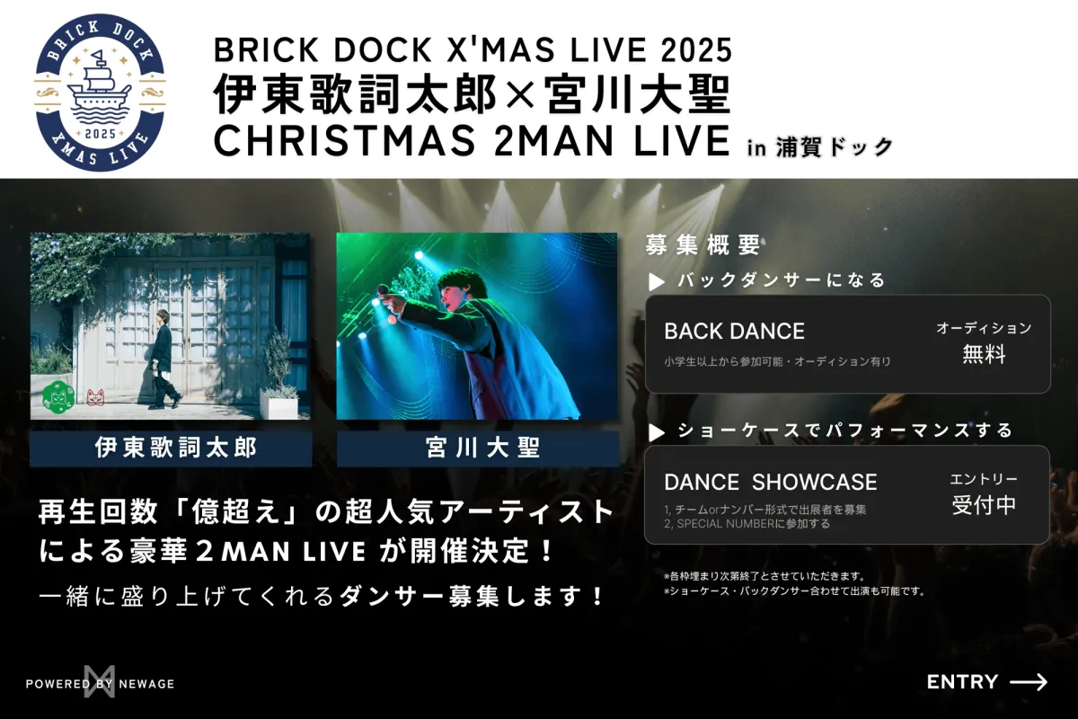2025年12月25日、神奈川県横須賀市の浦賀ドックで開催される特別なクリスマスライブ、「BRICK DOCK X’MAS LIVE 2025」にて、著名アーティストの伊東歌詞太郎さんと宮川大聖さんのバックダンサーを募ります。