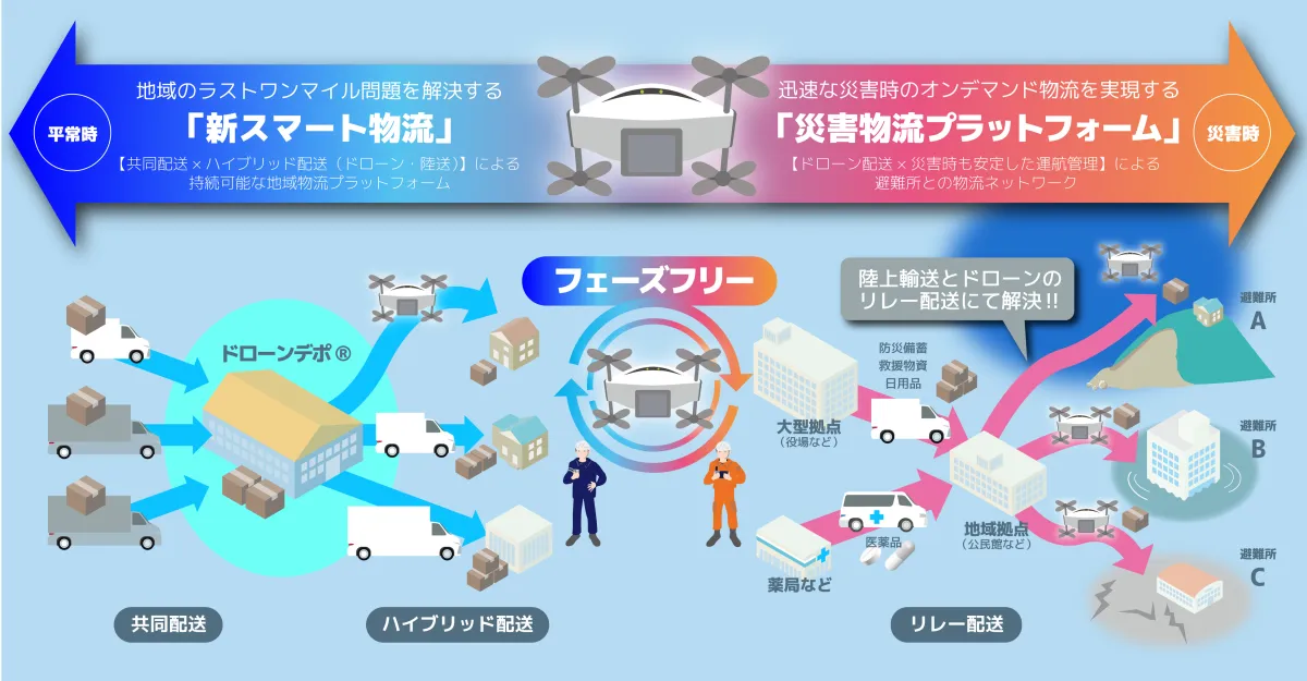 エアロネクストは2021年から地域の課題解決に向けた新たな物流インフラ「スカイハブ」を全国で推進し、2024年の能登半島地震では孤立した地域への医療品配送を実施しました。この経験は、災害時の物流システムの重要性を再認識させるものであり、事前に強固な体制を整える「フェーズフリー型災害物流対策」を考案しました。これにより、平時と有事の両方で地域住民の利便性を向上させることを目指しています。