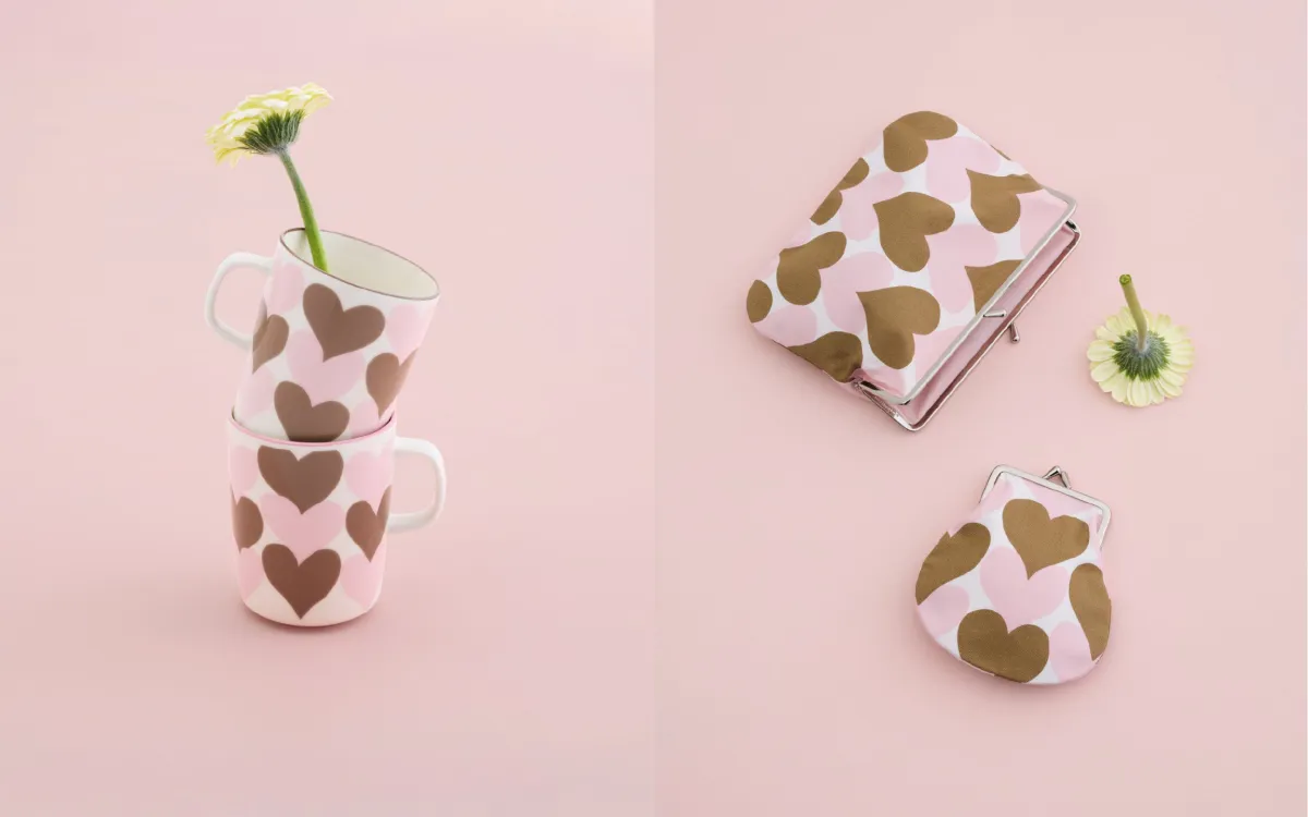今回のコレクションには、デザイナーのマイヤ・イソラ(Maija Isola)が1965年に手がけたシュダメット(Sydamet)デザインのアイテムが含まれており、サンド×ピンクの組み合わせがその特徴です。この色使いは、バレンタインの雰囲気にぴったりマッチしていて、大切な人への贈り物としても最適です。