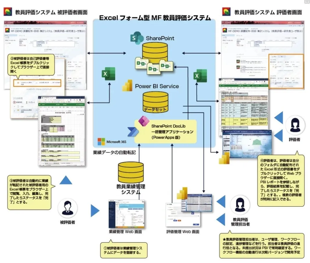SharePointやExcel Onlineを利用したユーザー・インターフェースを採用しており、さらにはPower AppsやPower Automateを活用することで、機関ごとの業務フローに応じた拡張が可能です。これにより、教員評価の多様なニーズに容易に対応できます。