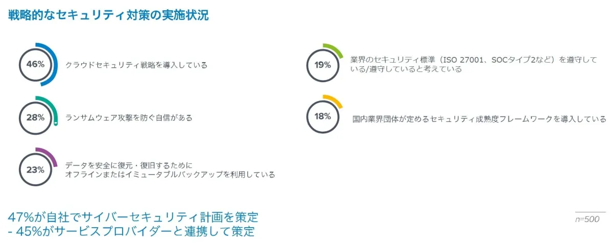 - - 全体の92%がサイバーセキュリティ戦略を持つ一方、約75%はランサムウェア攻撃を防ぐ自信がない。