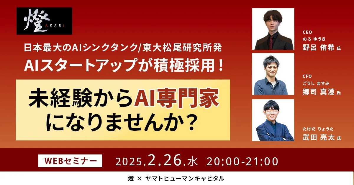 2025年2月26日、水曜日の夜、ヤマトヒューマンキャピタル株式会社が主催するウェビナーがオンラインで開催されます。このセミナーのテーマは、「未経験からAI専門家になりませんか?」。登壇者には、燈株式会社のCEO 野呂侑希氏、CFO 郷司真澄氏、そして武田亮太氏が顔を揃え、AIの未来と成長戦略について詳しくお話しします。