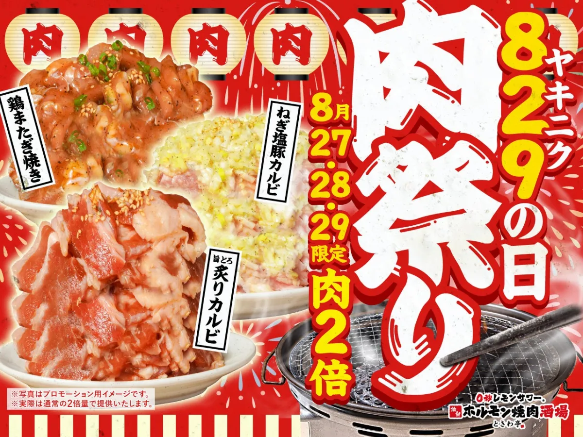 8月27日(水)から29日(金)の3日間、全国に展開する『0秒レモンサワーⓇ仙台ホルモン焼肉酒場 ときわ亭』にて『829(ヤキニク)の日 肉祭り』キャンペーンが開催されます。このキャンペーンでは、人気の焼肉メニュー3品を通常の倍量で提供。価格はそのままなので、肉好きにはたまらない限定イベントです。