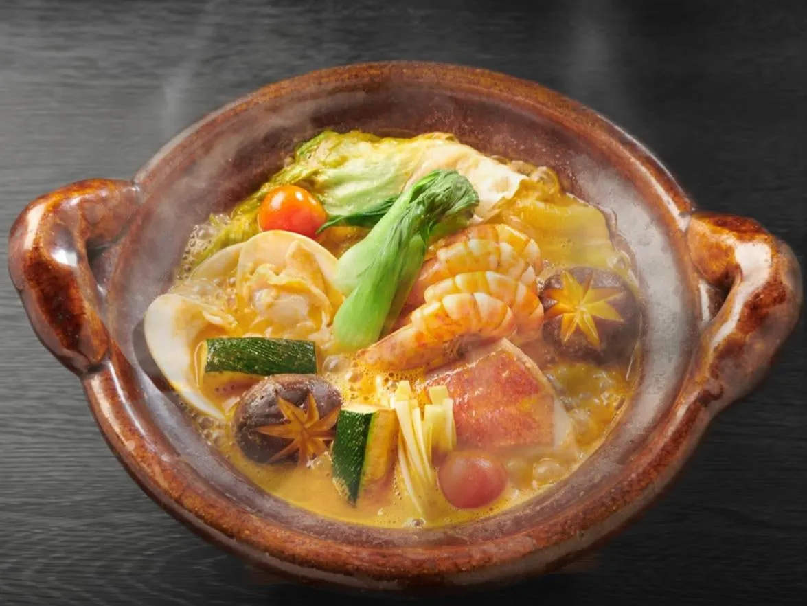 「海香鍋」は、エビの風味とトマトの酸味が調和するアメリケーヌソース仕立て。不漁が感じられる鯛やホタテを贅沢に使用し、魚介の出汁がたっぷりと楽しめる一品です。マスカルポーネチーズと白味噌を加えることにより、さらにコク深い味わいに仕上がりました。