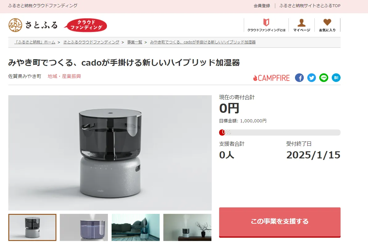 1つ目のプロジェクトは、みやき町で活動する事業者と連携し、空気清浄機メーカー「cado」が手掛ける新しいハイブリッド加湿器の開発を支援するものです。目標寄付額は100万円で、寄付期間は2024年11月11日から2025年1月15日までとなっています。