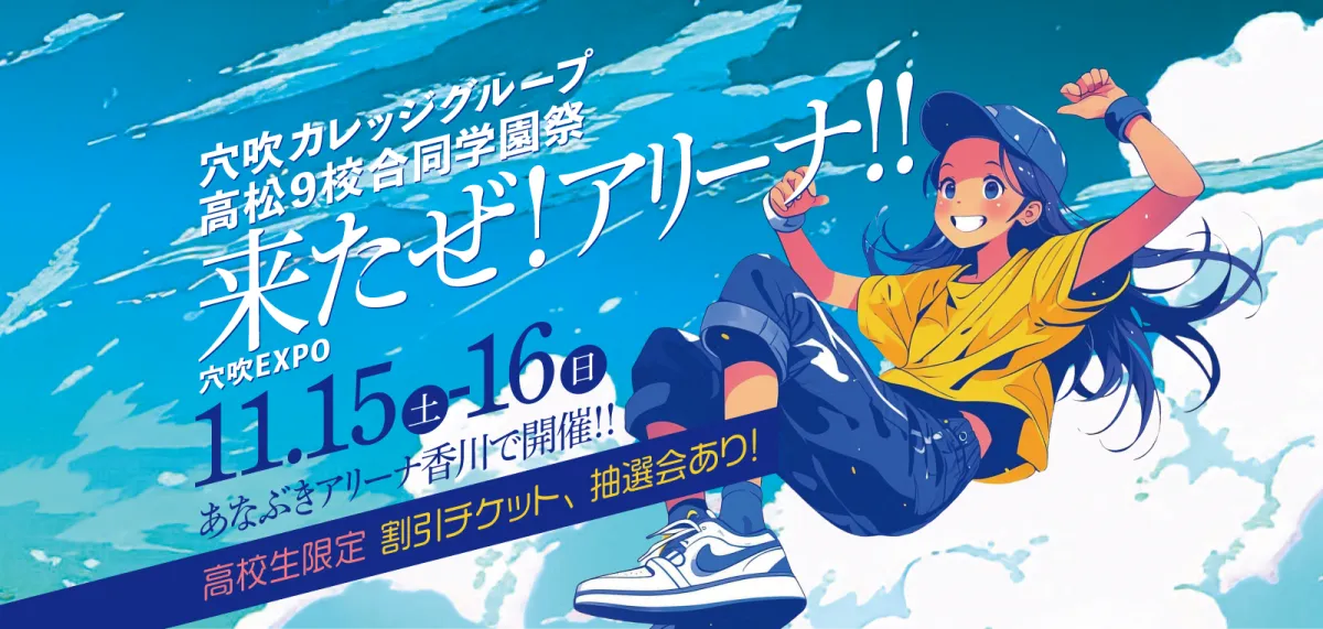 本イベントのテーマは「来たぜ! アリーナ!穴吹EXPO」。開催時間は両日ともに10時から16時までとなっており、参加校には穴吹コンピュータカレッジや穴吹ビジネスカレッジ、穴吹デザインカレッジなどが含まれています。主催は穴吹カレッジグループで、後援には香川県及び高松市の教育委員会や複数のメディアが名を連ねています。