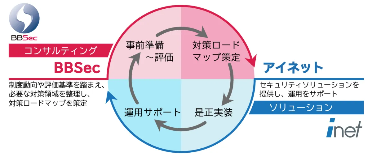 この新制度に向け、株式会社アイネットと株式会社ブロードバンドセキュリティ(BBSec)は共同で事前対策支援サービスを提供することを発表しました。このサービスは企業が円滑に制度の評価を受けられるようになることを目的にしています。