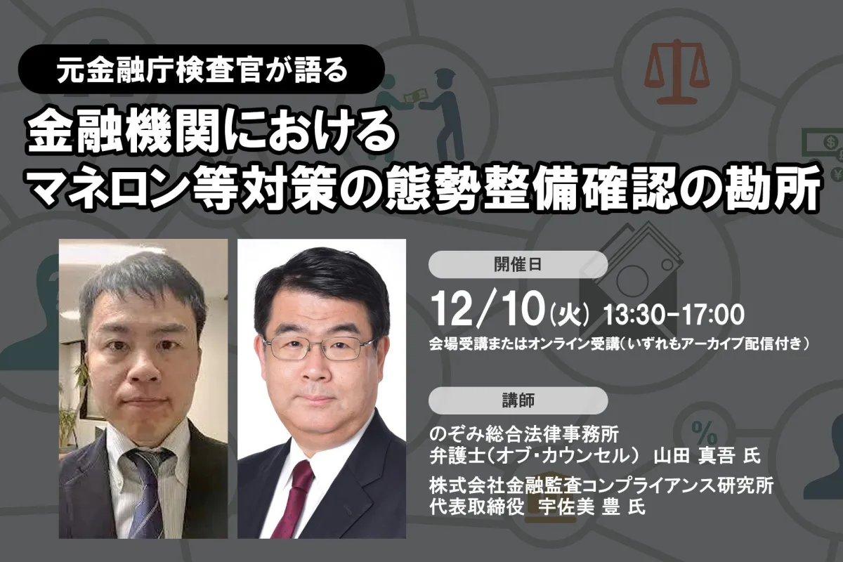 本セミナーでは、金融庁検査官の経験を持つ弁護士が、これらの最新動向を踏まえ、金融機関が直面するマネロン対策の課題と、具体的な対応策について解説します。