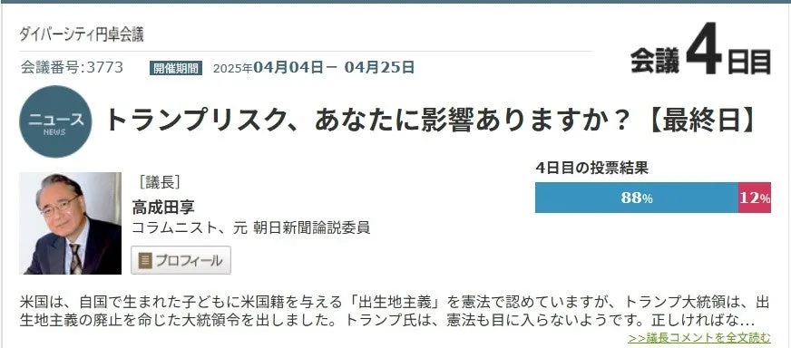 トランプ政権の関連リスクが働く人々に与える影響について深掘りする「ダイバーシティ円卓会議」が最近開催されました。この会議において強調されたのは、トランプリスクが私たちの日常や経済、安全保障、そして民主主義に与える波及効果です。議長を務めたのは、著名なコラムニストであり、元朝日新聞の論説委員である高成田享氏です。