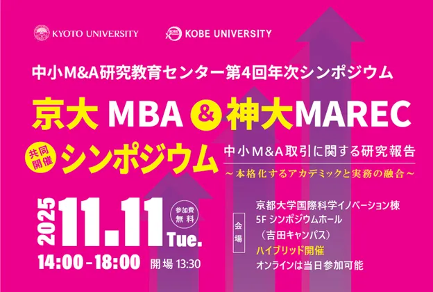 2025年11月11日、京都大学と神戸大学が共同で第4回年次シンポジウム「中小M&A取引に関する研究報告~本格化するアカデミックと実務の融合~」を開催します。このシンポジウムは、中小企業のM&Aをテーマにした初の共同開催となり、産学連携が実を結ぶ場となります。