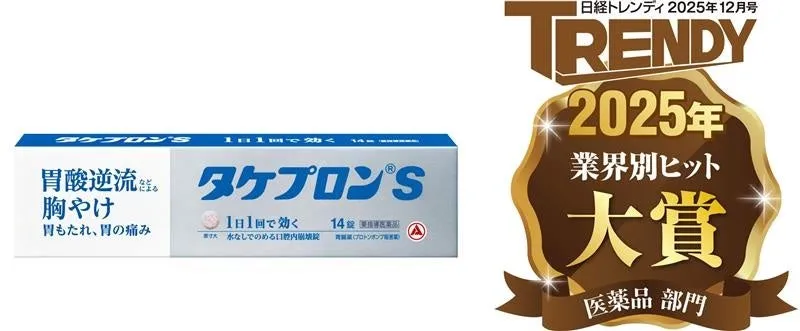 2025年8月1日にアリナミン製薬株式会社から発売された胃腸薬「タケプロン®s」が、日経トレンディ誌の特集「2025年ヒット商品ベスト30」において、医薬品部門の業界別ヒット大賞を受賞しました。この賞は、新サービスや商品の中で、売れ行き新規性、影響力を基準に選ばれるもので、特に「タケプロン®s」はその強力な胃酸分泌抑制効果で注目されています。