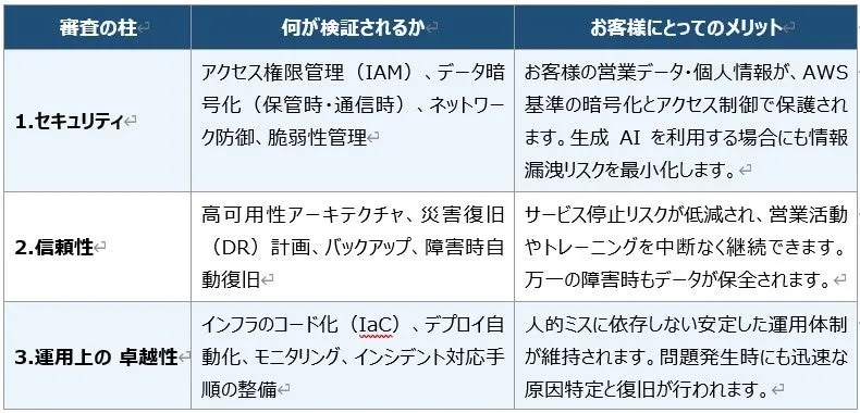 FTRは、AWSパートナーが提供するソリューションを、AWSのベストプラクティスに基づいて技術的に検証する制度です。このレビューでは、セキュリティ、信頼性、運用上の優れた性能という3つの観点からリスク評価が行われ、無事に通過した製品は「AWS Qualified Software」としてAWS Partner Solutions Finderに掲載されます。