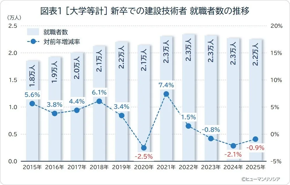 近年、建設業界では新卒での就職者数が減少傾向にあることが報告されています。総合人材サービス会社であるヒューマンリソシア株式会社が発表した最新データによると、2025年3月卒業者の建設技術者への新卒就職者数は約2.2万人で、前年比0.9%減と3年連続で減少しています。この調査は、文部科学省が提供する「学校基本調査」を基に、大学院、大学、短大、高専、専修学校を卒業した人たちの職種別就職データを集計・分析したものです。