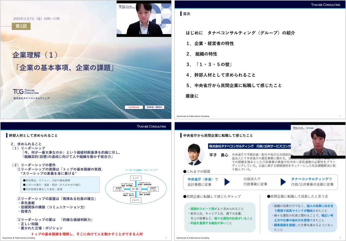 参加者はタナベコンサルティングのHRコンサルティング事業部の大木悠佑ゼネラルパートナーと、行政/公共サービスコンサルティングの平子勇心マネジャーから、「企業の基本事項と課題」をテーマにした内容を学ぶことができました。 彼らは企業経営者の特性や必要なスキル、さらに中央省庁から民間企業への転職事例を交えて、非常に実践的な情報を提供しました。