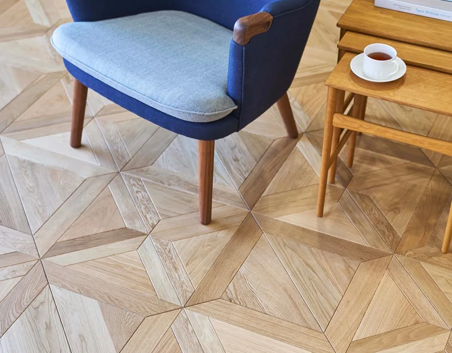 特に注目すべき点は、表面に用いられている2mmの挽板です。この素材によって、寄木張りならではの深みと豊かな表情が際立ちます。製品サイズは施工性を考慮し、1尺×6尺とされており、広々としたリビング空間にも自然に溶け込むデザインが特徴です。