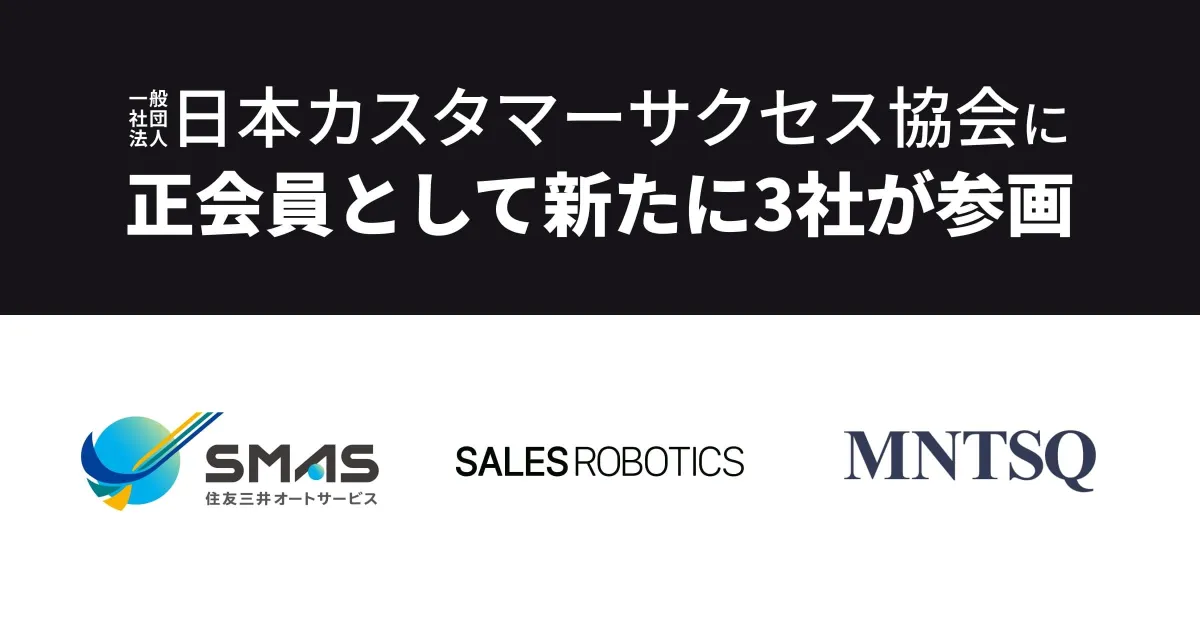 2024年11月、一般社団法人日本カスタマーサクセス協会は新たに3社を正会員として迎え入れることを発表しました。新規会員として、住友三井オートサービス株式会社(SMAS)、SALES ROBOTICS株式会社、MNTSQ株式会社の3社が名を連ね、カスタマーサクセスの重要な役割を担うことが期待されています。