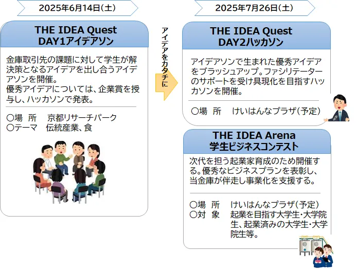 京都で新たなアイデアを生み出したい学生たちのために、京都中央信用金庫が主催する二つのイベント、「THE IDEA Quest」と「THE IDEA Arena」が開催されます。これらのイベントは、若者のアントレプレナーシップを促し、起業家を目指す学生たちの挑戦の場となることを目的としています。