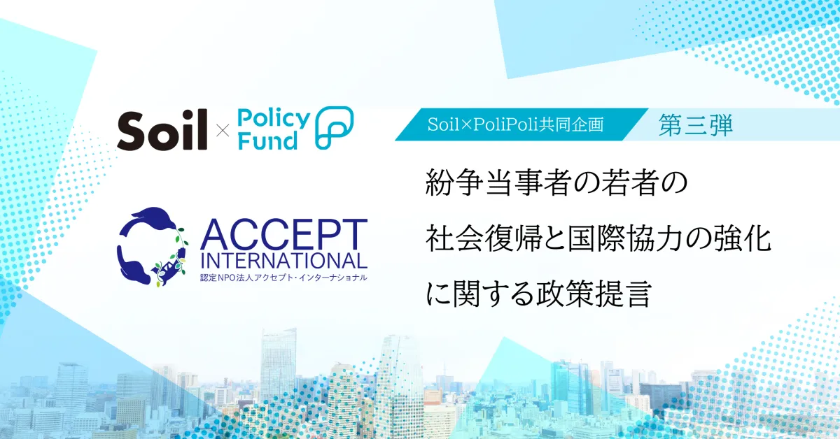 近年、テロや紛争による影響を受けた地域では、若者が社会復帰するための支援が急務となっています。そんな中、株式会社PoliPoliと公益財団法人Soilが共同で立ち上げた「SoilxPolicy Fund」が認定NPO法人アクセプト・インターナショナルを見出しました。これは「儲からない」けれども「意義がある」社会課題に取り組む団体を対象にした支援プロジェクトです。