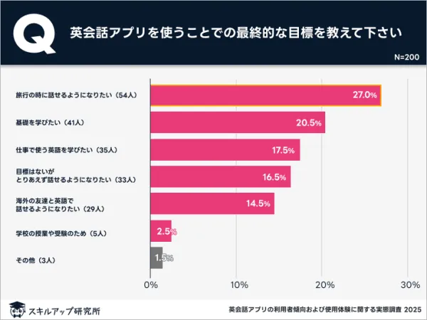 調査の結果、英会話アプリの主な利用目的は「旅行の時に話せるようになりたい」という意見が最も多く、全体の27%を占めました。また、「基礎を学びたい」「仕事で使う英語を学びたい」といった目的もみられ、ユーザーによってそれぞれ異なるニーズがあることが分かりました。これは、英会話アプリが多様なカリキュラムを提供している証拠です。