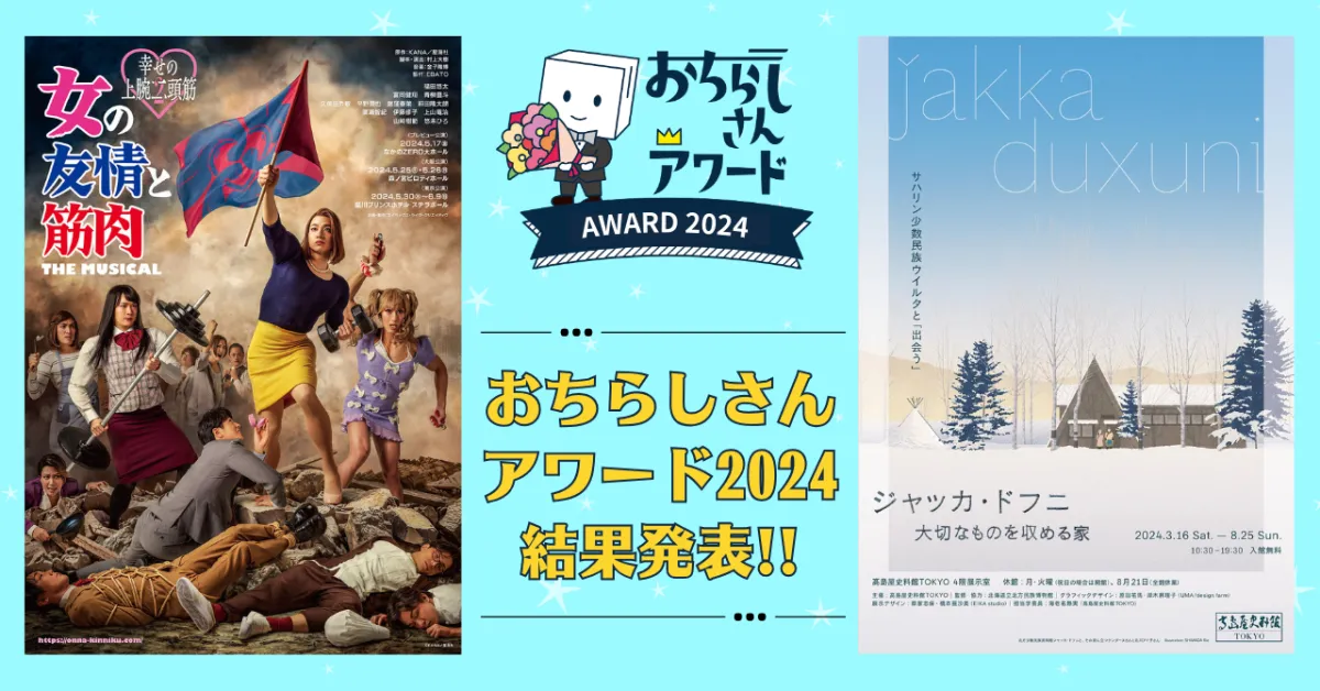 2024年2月5日、株式会社ネビュラエンタープライズによる「おちらしさんアワード2024」の結果が明らかになりました。このアワードは、公演や美術展で配布されたチラシの中から、観客の選考を経て最も優れた作品を決定するイベントです。舞台版の大賞には、人気漫画が原作のミュージカル『女の友情と筋肉 THE MUSICAL -幸せの上腕二頭筋-』が選ばれ、美術版では高島屋史料館TOKYOの『ジャッカ・ドフニ大切なものを収める家―サハリン少数民族ウイルタと「出会う」』が栄冠に輝きました。