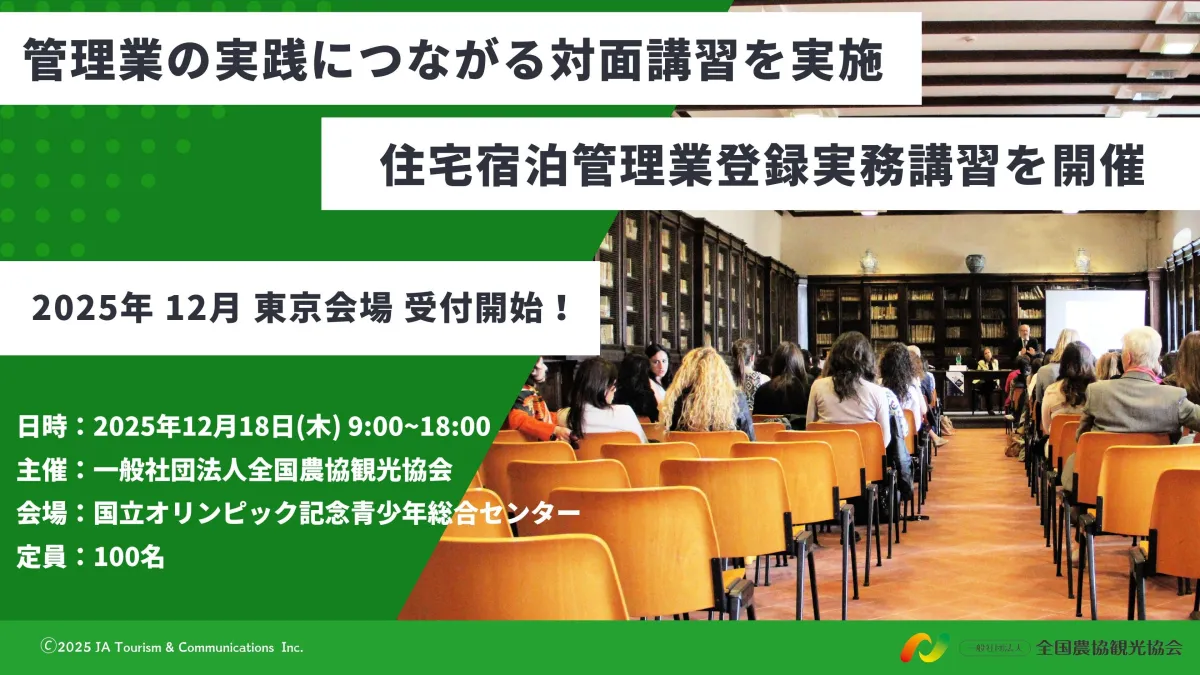 一般社団法人全国農協観光協会が主催する「住宅宿泊管理業登録実務講習」が、再び東京・渋谷で開催されることが決まりました。この講習は、国土交通大臣登録の実務講習機関として、国内での住宅宿泊業に必要な知識とスキルを身につけるための重要な機会です。これまでに約900名もの受講者がこの講習を修了しており、その実績からもその信頼性が伺えます。