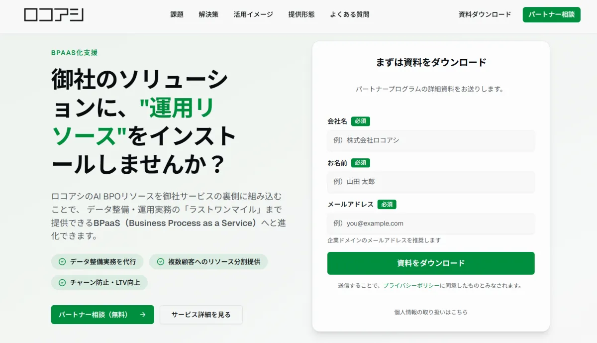 ロコアシは、自社のAI BPOサービスと提携することで、こうした課題を解決することを目指します。「AIソリューション + ロコアシAI BPO = BPaaS化」という考え方の下、プログラムは顧客が求める運用支援のニーズに応える柔軟性を持たせています。