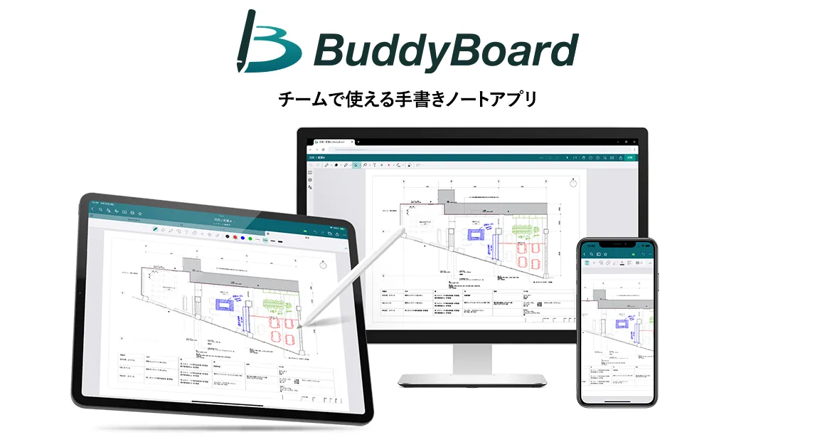BuddyBoardは、手書きの書き込みをリアルタイムで共有できる便利なノートアプリです。アプリ内にはペンやテキスト入力、スタンプなど、手軽にメモを取ることができる機能が充実しています。2021年に無償版のテストマーケティングが開始されて以来、ユーザーは多様なシーンでこのアプリを活用してきました。特に、2022年から提供が始まった法人向けの有料サービスは、建築業界での人気が高く、図面や資料のチェックバックを円滑に行うためにも役立っています。