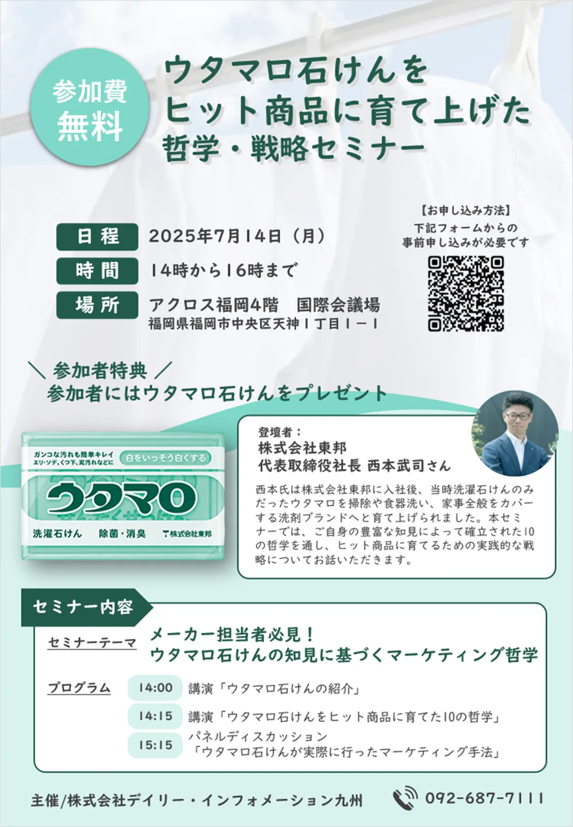 株式会社デイリー・インフォメーション九州が主催する「ウタマロ石けんをヒット商品に育て上げた哲学・戦略セミナー」が、2025年7月14日(月)にアクロス福岡で開催されます。このセミナーでは、ウタマロ石けんという有名なロングセラー商品の成功事例を通じて、マーケティング戦略や販売哲学について深く掘り下げます。
