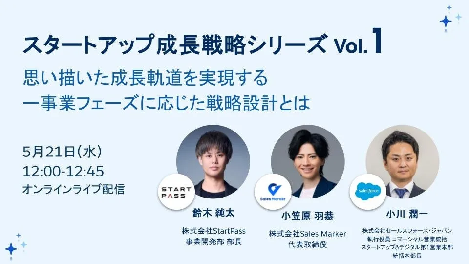 取り組みの第一弾として、2025年5月21日(水)にオンラインセミナーを開催します。セミナーのテーマは「思い描いた成長軌道を実現する - 事業フェーズに応じた戦略設計とは」となっており、Salesforce、Sales Marker、StartPassの3社がそれぞれの視点から「営業組織」をどう形成していくかについての実践的なノウハウを提供します。