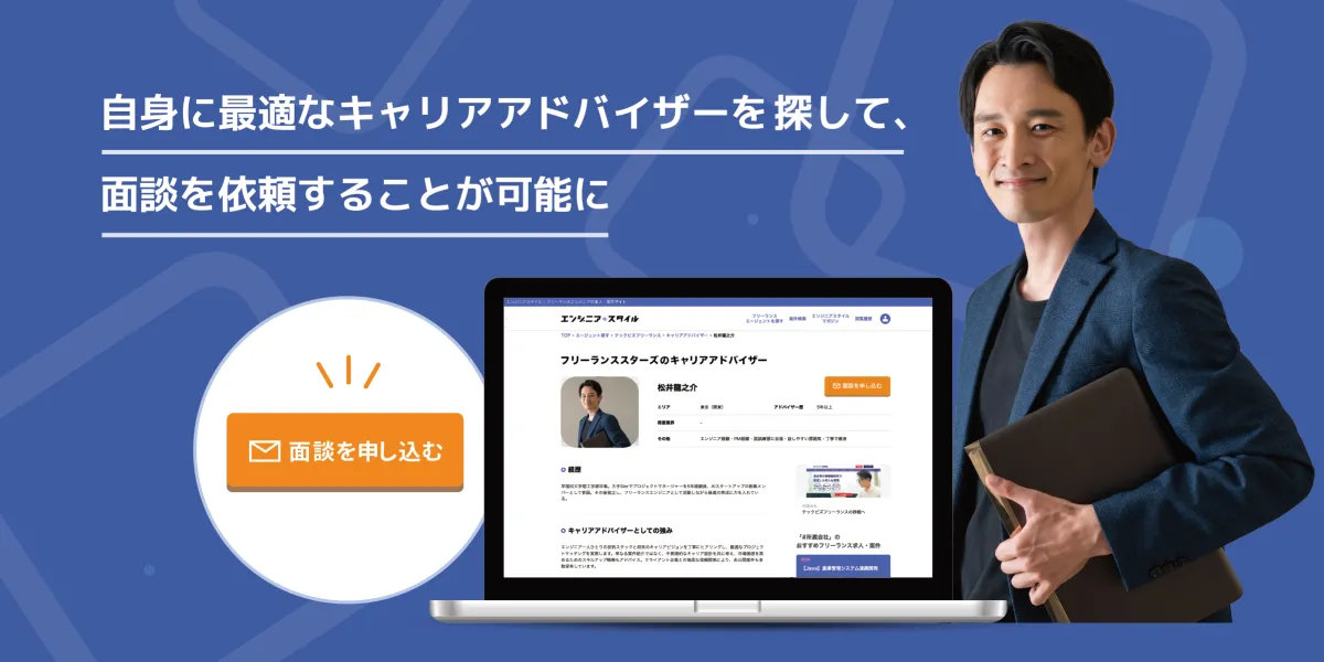 フリーランスエンジニア自身がアドバイザーを選ぶことができるため、相談したい内容や自身の希望に合った人選が可能となります。それによって、案件選びがより安心して行えるようになります。また、アドバイザーから提供される年収やキャリア形成に関する情報は、フリーランスエンジニアとしてのキャリアアップを目指す上で大きな支えとなるでしょう。