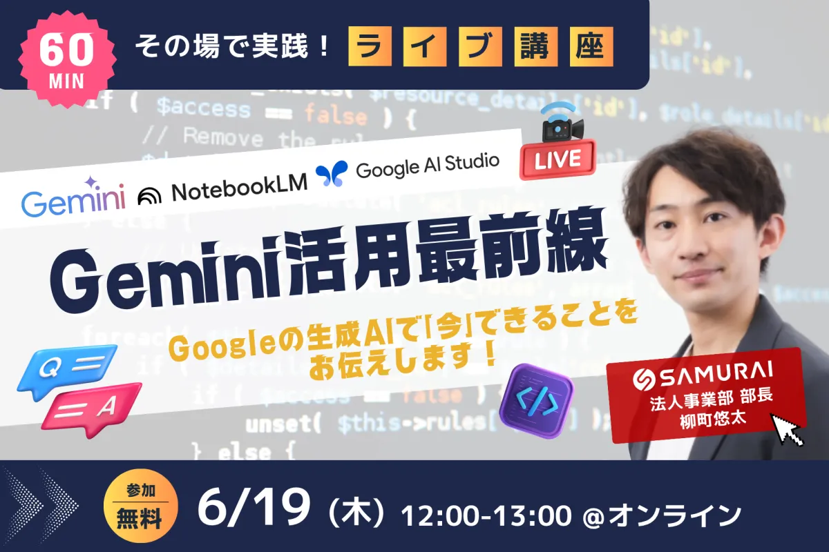 株式会社SAMURAIが提供するこの講座は、生成AIとプログラミングの融合がもたらす可能性を体験できる絶好のチャンスです。2025年6月19日(木)にオンラインで開催され、参加費は無料。講座の内容は盛りだくさんで、初心者から経験者まで、誰もが興味を持って参加できる設計となっています。