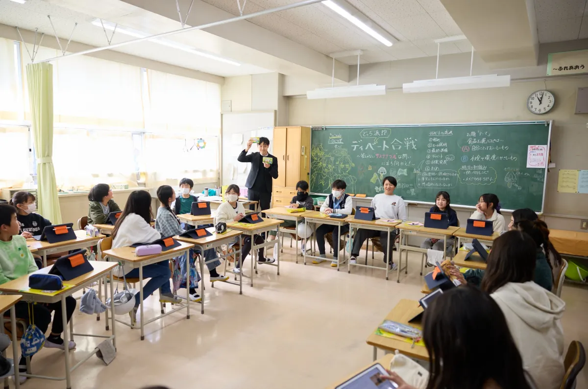 横浜市立川和小学校で行われた授業は、株式会社明治、株式会社朝日新聞社、そして株式会社朝日学生新聞社の共同開発による教材『きのこの山・たけのこの里と学ぶ どっち派!? ディベート合戦』を活用しました。この教材は、子どもたちがサステナブルというテーマを楽しみながら考えるためのものです。