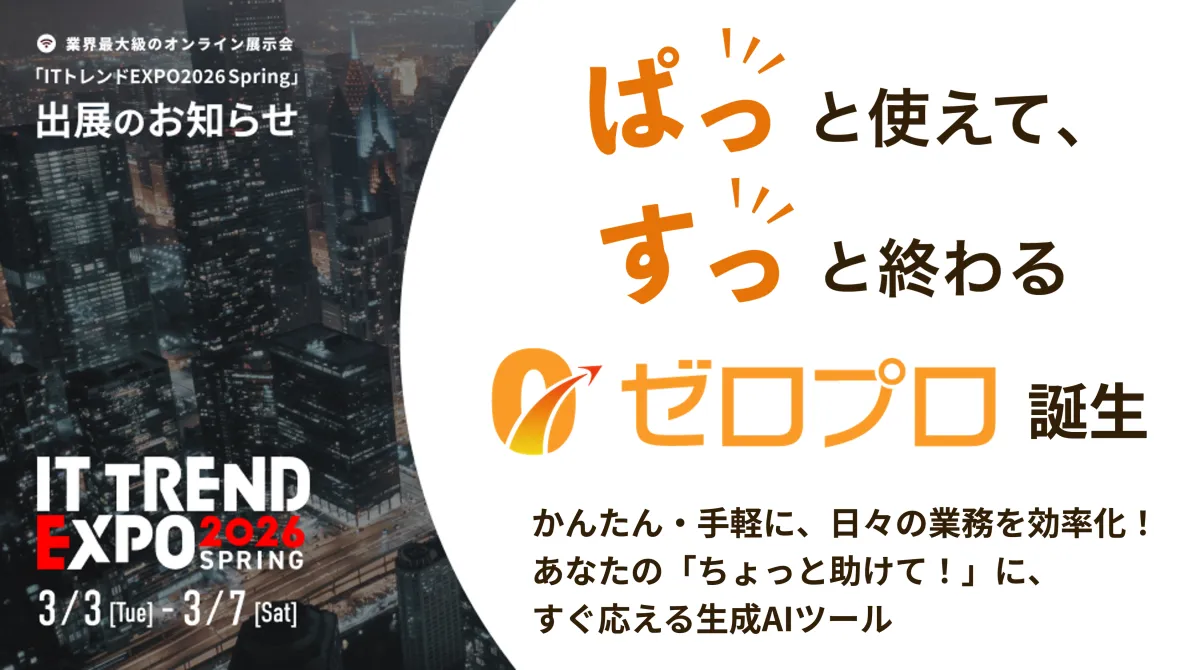 「ITトレンドEXPO 2026 Spring」では、各社が最新のITサービスや業務効率化ソリューションを展示します。今回は『ゼロプロ』のサービス概要や具体的な活用イメージを分かりやすく説明する予定です。この展示会はどこにいても参加できるオンライン形式ですので、気軽に情報を収集できます。