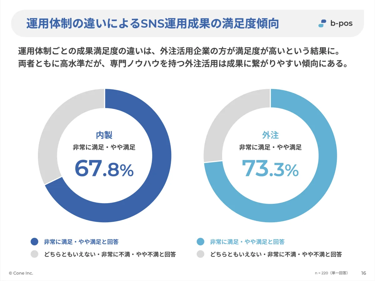 調査の結果、内製でSNS運用を行っている企業の満足度は約68%である一方、外注を利用している企業の満足度は74%に達しました。この傾向は、専門的なノウハウをもつ運用代行会社の支援が、より高い成果を生む要因であると考えられます。