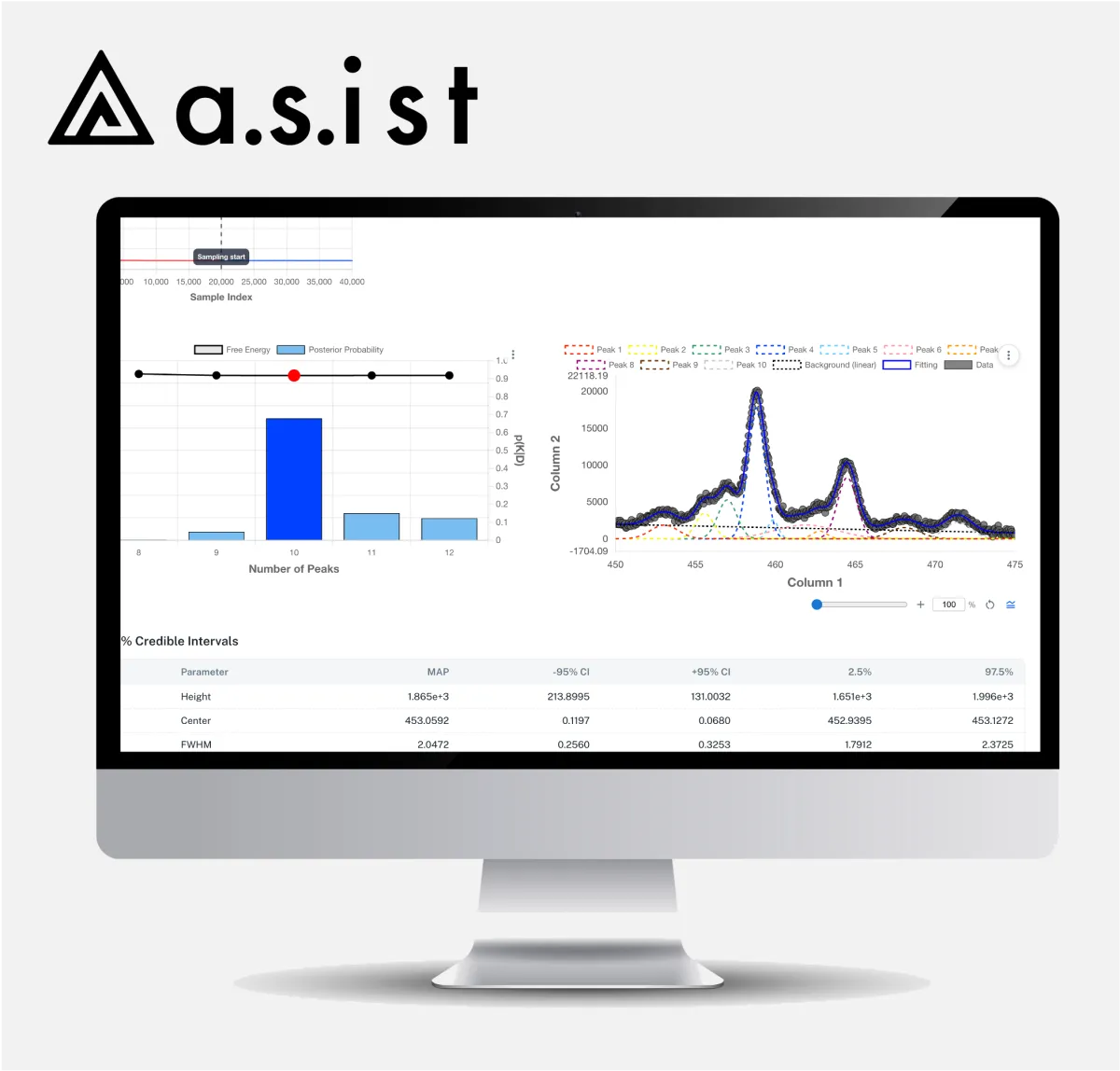 AutoStatSpectraは、指定された範囲内でのモデルを比較し、事後確率に基づいて最も適切なピーク数を自動選定します。更に、各ピークの高さや位置などの詳細データも自動で推定します。