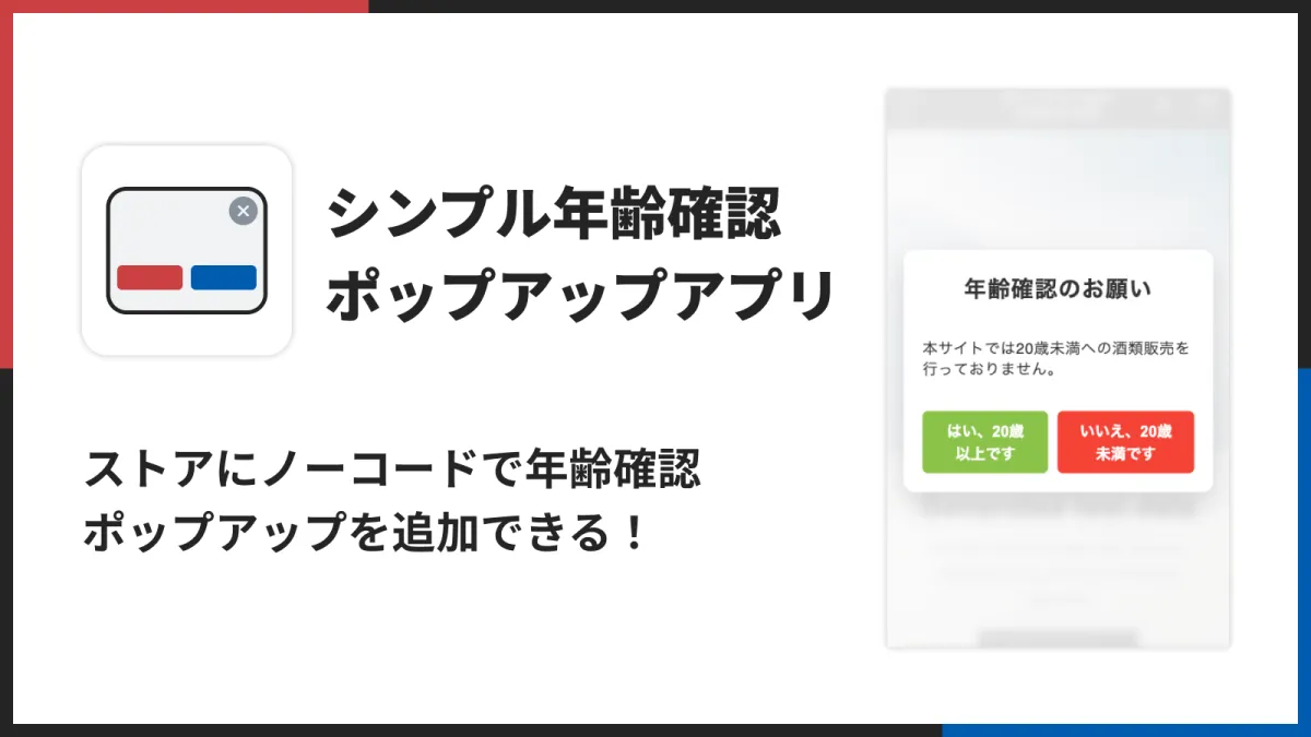 まず、訪問者がショップにアクセスする前に表示される年齢確認ポップアップが簡単に設置可能です。特に、商品の年齢制限に合わせた適切な確認方法をノーコードで実現できるため、専門知識がない運営者でも手軽に導入できます。