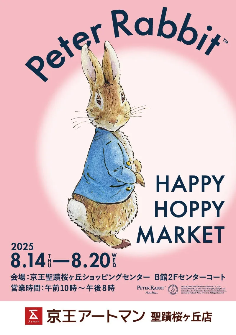 2025年8月14日(木)から2025年8月20日(水)まで、京王聖蹟桜ヶ丘ショッピングセンターのB館2Fセンターコートで『ピーターラビット™ HAPPY HOPPY MARKET』が開催されます。このイベントは、株式会社京王アートマンが主催するもので、可愛らしいピーターラビットの世界観を体験できる内容となっています。