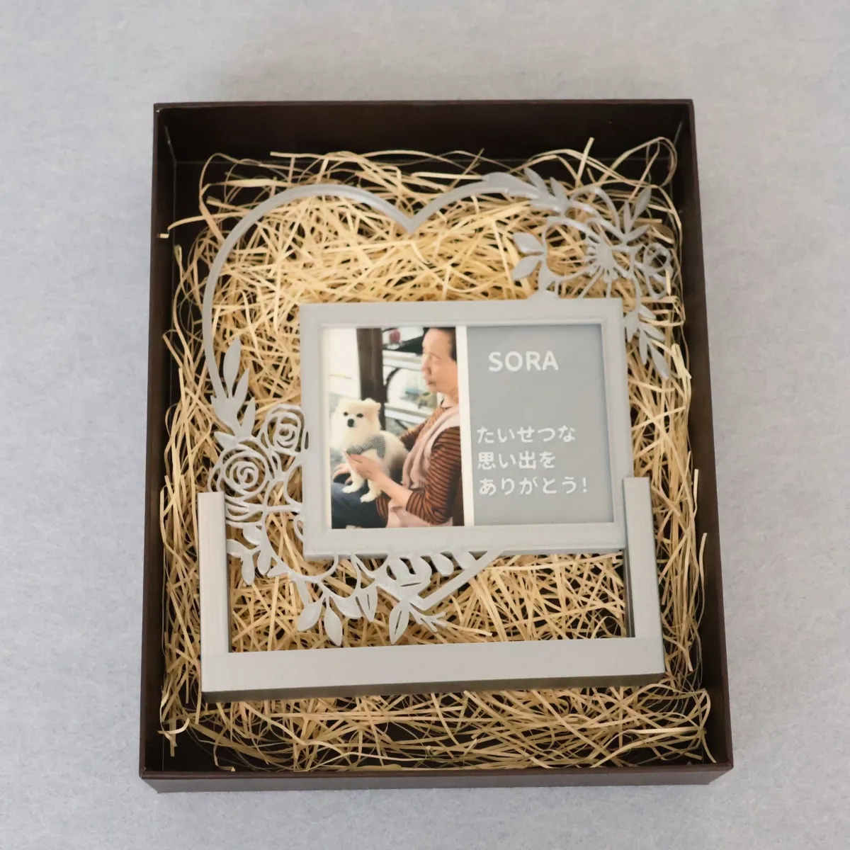 お客様の手によって、名前やメッセージ、さらには日付まで自由に配置できるため、個々のペットに合わせたパーソナルなフォトフレームとなります。「Momo」「Sora」といった名前のほか、「いつもそばにいてくれてありがとう」といった心温まるメッセージも刻むことができます。