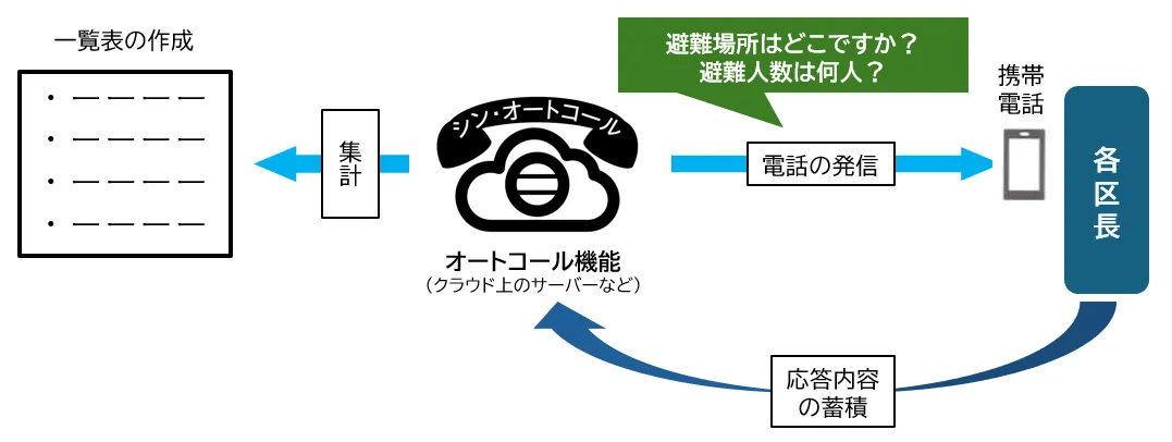 訓練では、仮設住宅にいる住民も含め、各避難場所や経路の確認が行われます。具体的には、指定緊急避難場所や津波避難ビルへの避難を行った後、各区長が避難した人数を確認します。そして、「シン・オートコール」によって自動音声による確認が行われ、報告された避難者数が集計されます。この流れにより、迅速な情報収集と把握が可能となります。