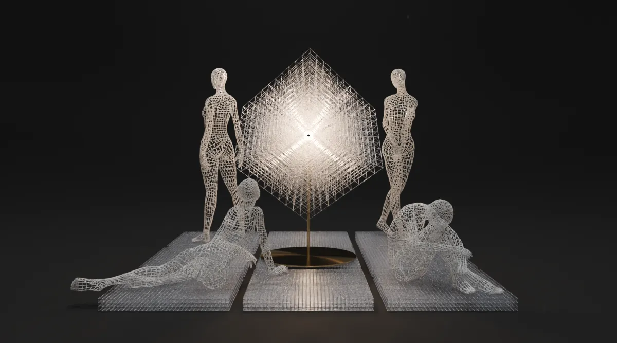 「130」の展示プランは《Core Shell Lounge》と呼ばれる新作インスタレーションです。主役となるのは、複雑な多層グリッド構造を持つランプ《Helio》。このランプは、「コア(核)」としての役割を果たし、その光に引き寄せられる形で周囲に配置された“シェル構造の人”が存在します。内と外、主役と従者、その境界が揺らぐ体験を提供する実験的なラウンジ空間に、来場者は身を置くことができます。