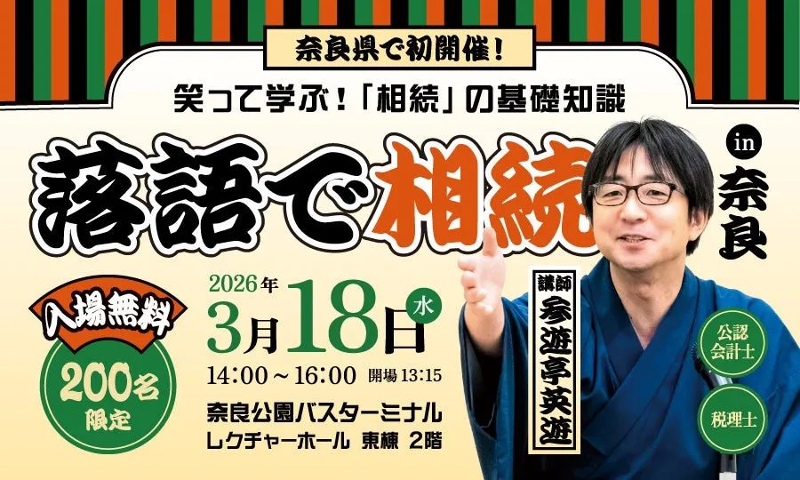 2026年3月18日、水曜日に奈良市の奈良公園バスターミナル レクチャーホールで、相続専門の税理士であり社会人落語家でもある参遊亭英遊(石倉英樹)氏を招いた特別セミナーが開催されます。このセミナーのテーマは、「落語で相続」。