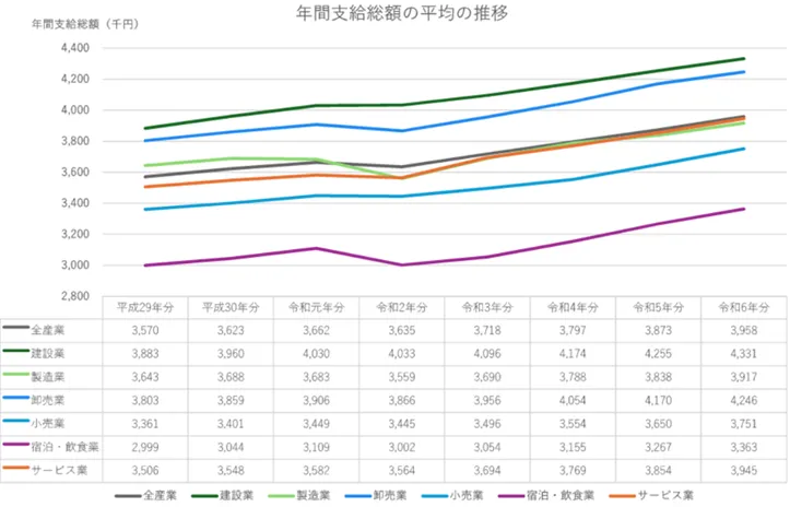 興味深いことに、この指標によると、どの産業でも平均賃金は過去4年間で持続的に上昇していることがわかります。コロナ禍の影響を受けた2022年には賃金が一時的に落ち込みましたが、2023年にはほぼ全ての産業において賃金が回復し、その後も安定して上昇を続けています。新型コロナウイルスの影響で止まっていた賃金水準が、しっかりと回復の兆しを見せているのです。